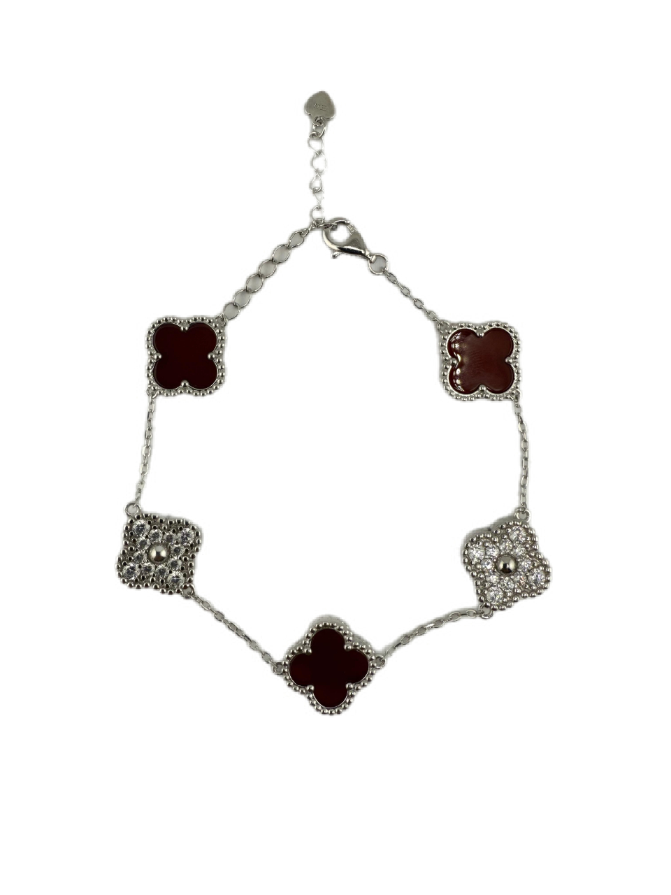 Sterling Silver White/Yellow 5-Clover Onyx & CZ Bracelet