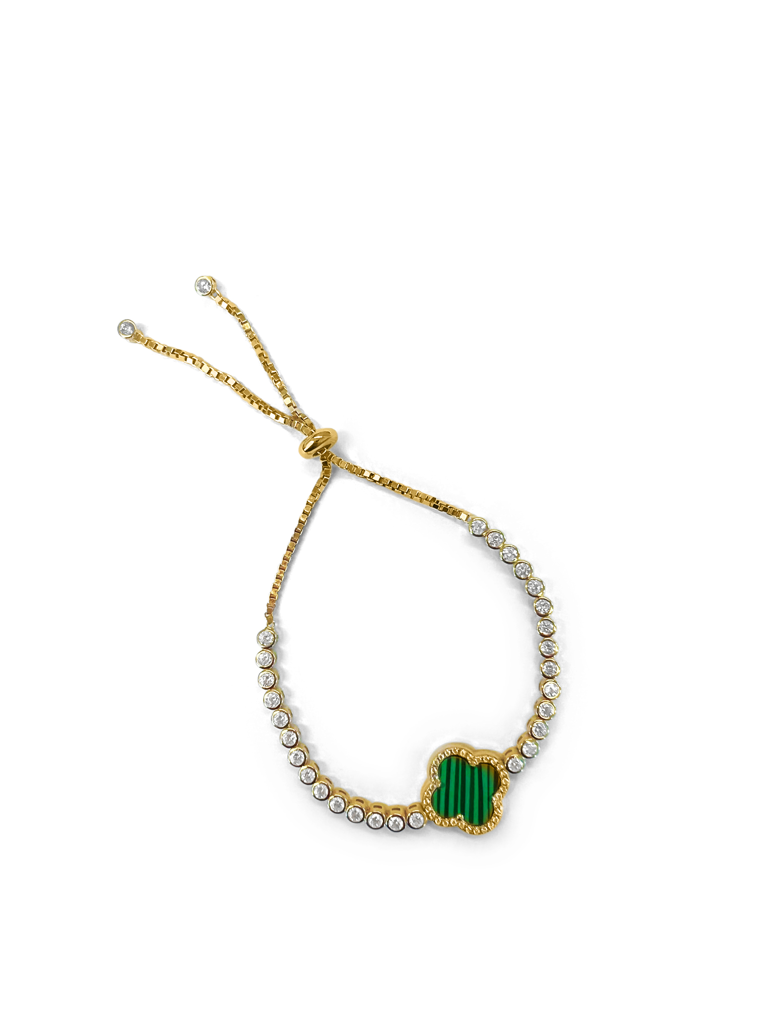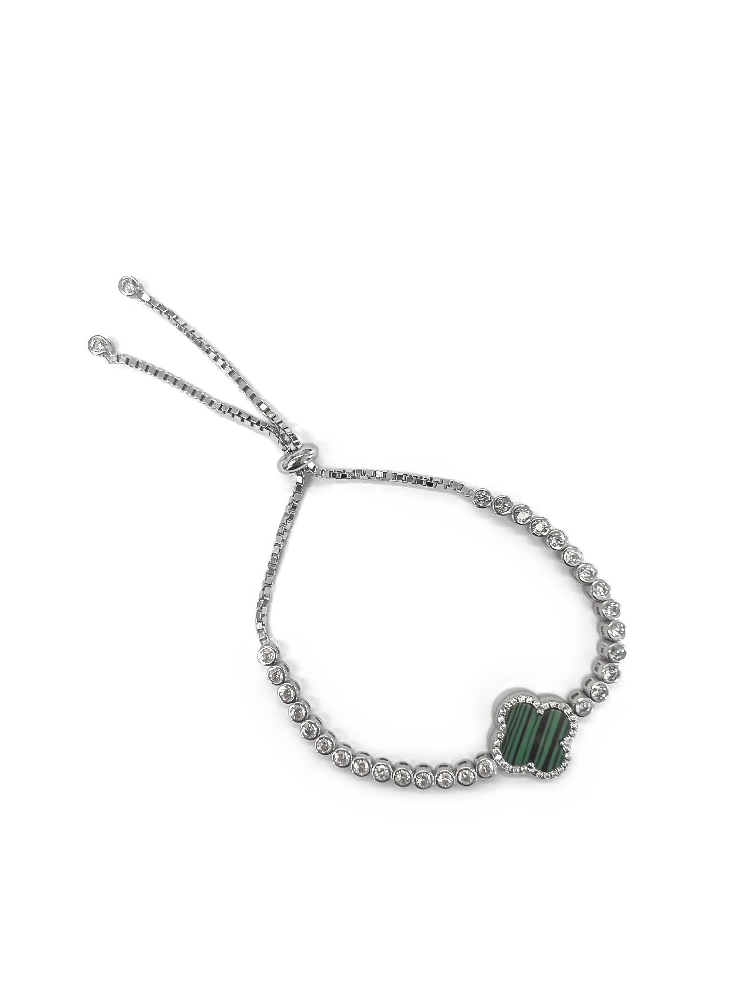 Sterling Silver White/Yellow Clover Malachite Adjustable Bracelet